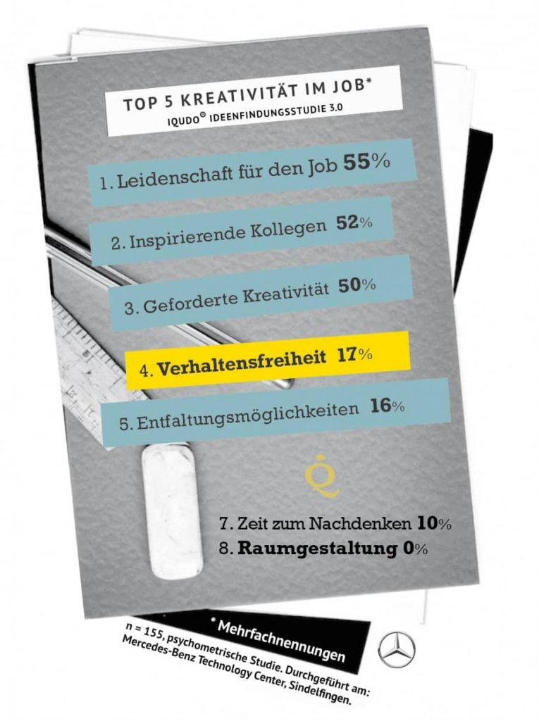 Ganz anders jedoch die “job-kreativen” Ingenieure – immerhin mehr als jeder Dritte. So zeigte die valide IQudo-Studie, dass die Raumgestaltung überhaupt keine Rolle für Einfallsreichtum spielt. Kein Einziger der Mercedes-Benz Ingenieure kreuzte die Raumgestaltung an. Eine kleine Sensation! Zumal Tina Seelig, Professorin an der Stanford University in 2012 die These aufgestellt hatte, dass kreative Räume zu kreativer Arbeit führen würde (“Creative spaces lead to creative work!”).