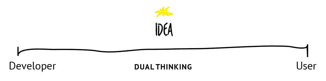 With Dual Thinking, the developer aims for a solution rooted in both his personal aspirations and the user’s needs and wants. This dual method integrates intrinsic drive and empathy.