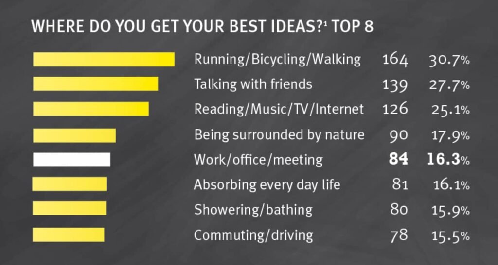 According to the IQudo ideation survey 2015 the number one reason for finding ideas, mentioned by 31% of respondents, are movement activities, like running, bicycling, and walking.